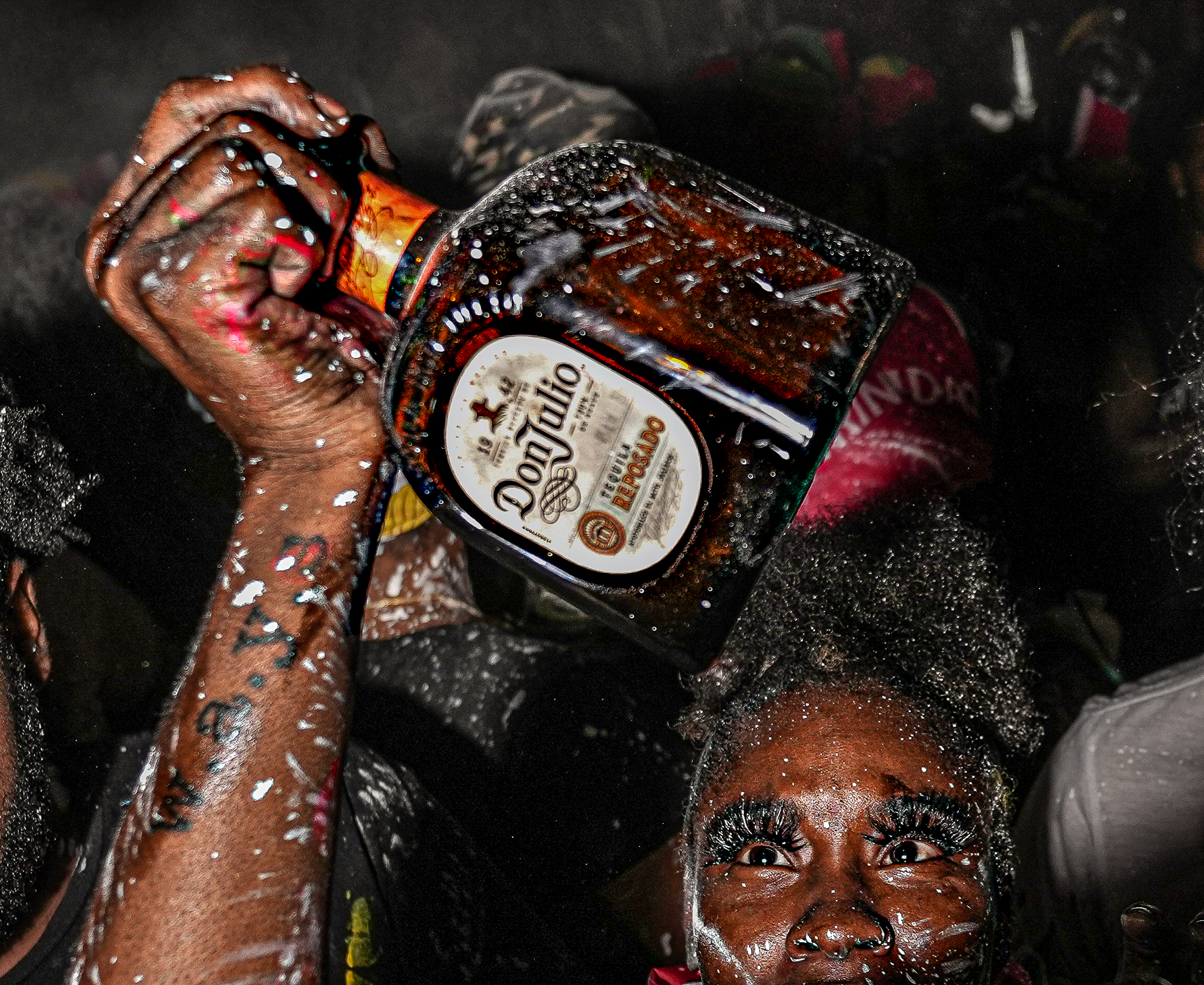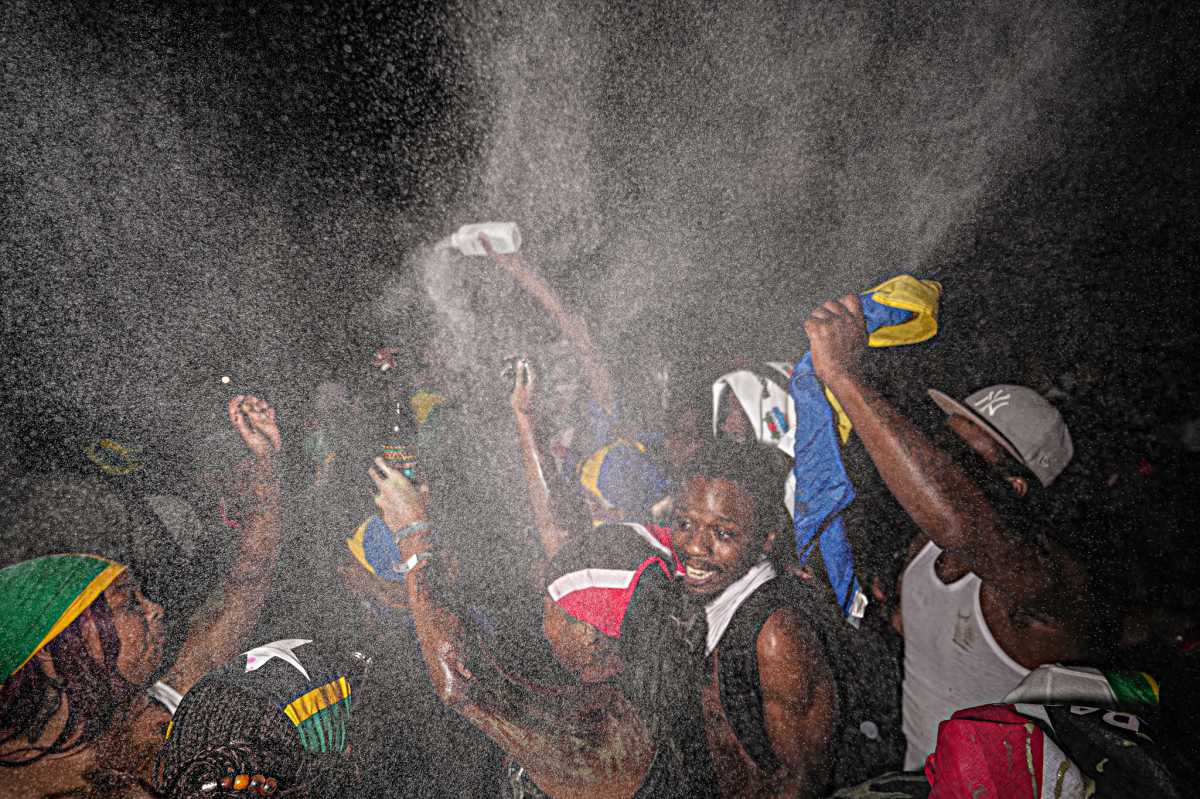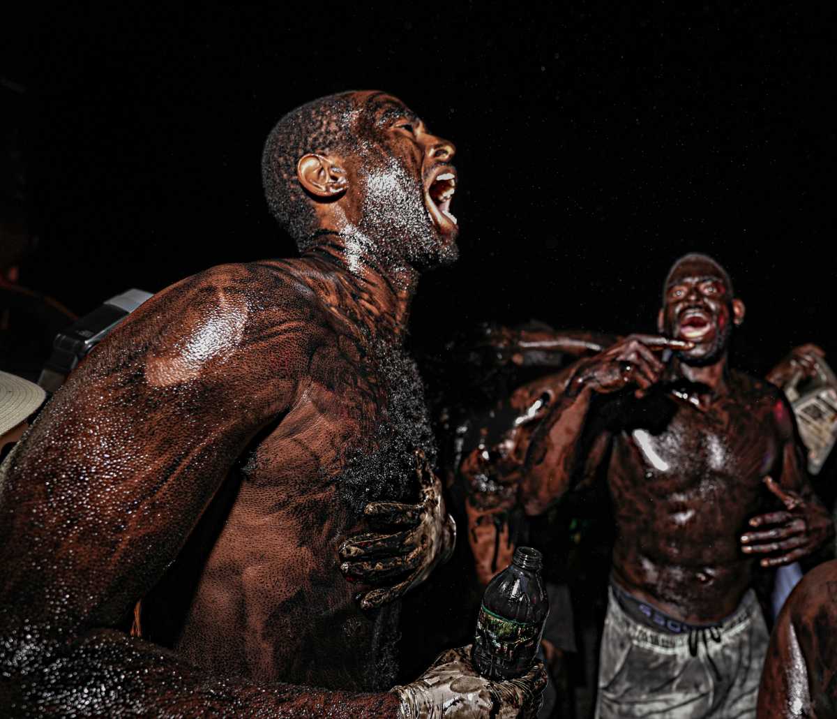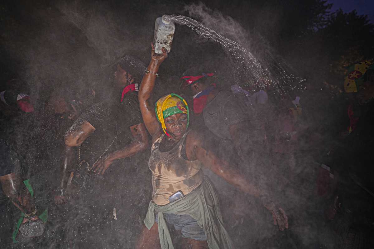 Rubbing oil and throwing paint and powder at one another, partygoers twirled and frolicked in a rush of color and the dawn light. The oil and paint are meant to symbolize liberation while also defying the colonialism of the past.