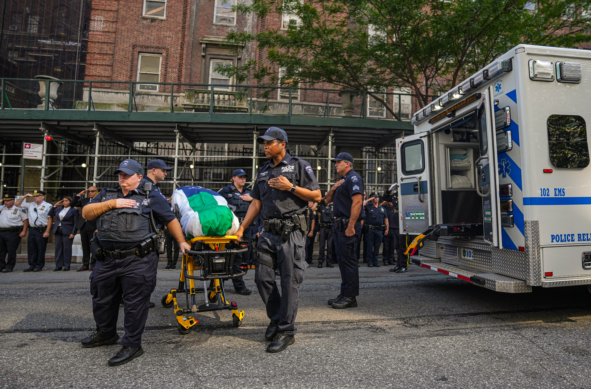 Draped in an NYPD flag, Officer Islam’s remains were wheeled out of the office and into an awaiting ambulance under the salute of fellow cops. As a part of a convoy. His body was then transported to the Maajid Funeral Home in the Bronx, where preparations will be made for the final send-off.