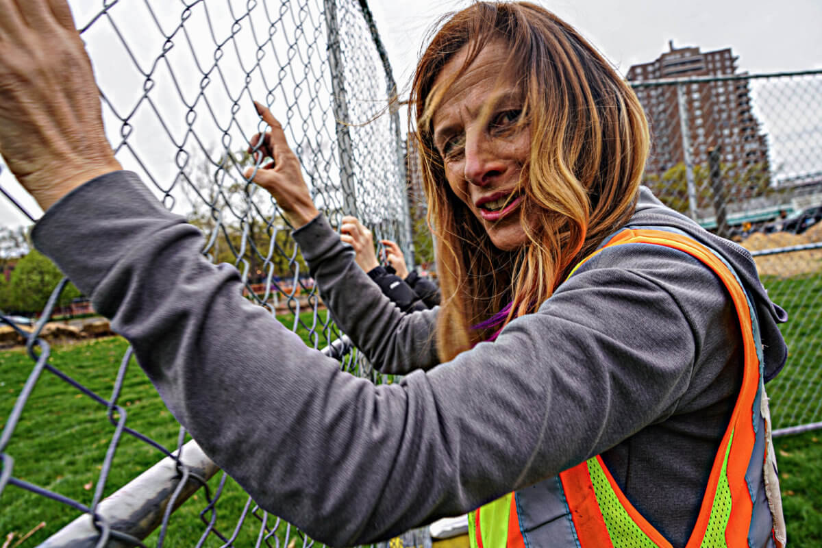 Calling themselves tree defenders, several park goers cheered for a young woman on April 25 who scaled mesh fencing surrounding a construction area in the East River Park before climbing onto the base of a tree near Corlears Hook Park between Cherry and Grand Streets.