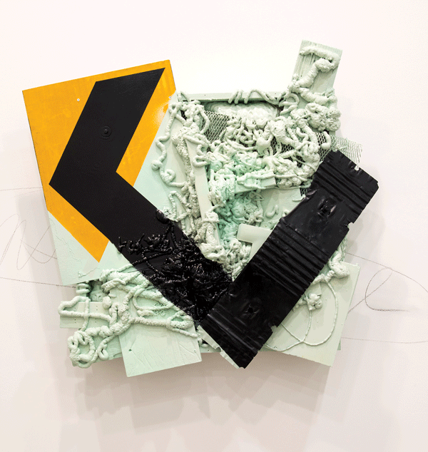 JOE FLEMING: “SUCKERPUNCH” Fleming’s first New York solo show features a selection of paintings that employ an array of recycled materials. Enamel and spray foam are among the favored ingredients here and aid in generating an overall raw energy. The better-known Anselm Reyle comes to mind, but Fleming keeps his shapes more distinctly graphic. He embraces geometry in his forms, which are contrasted with brushy gestural backgrounds.