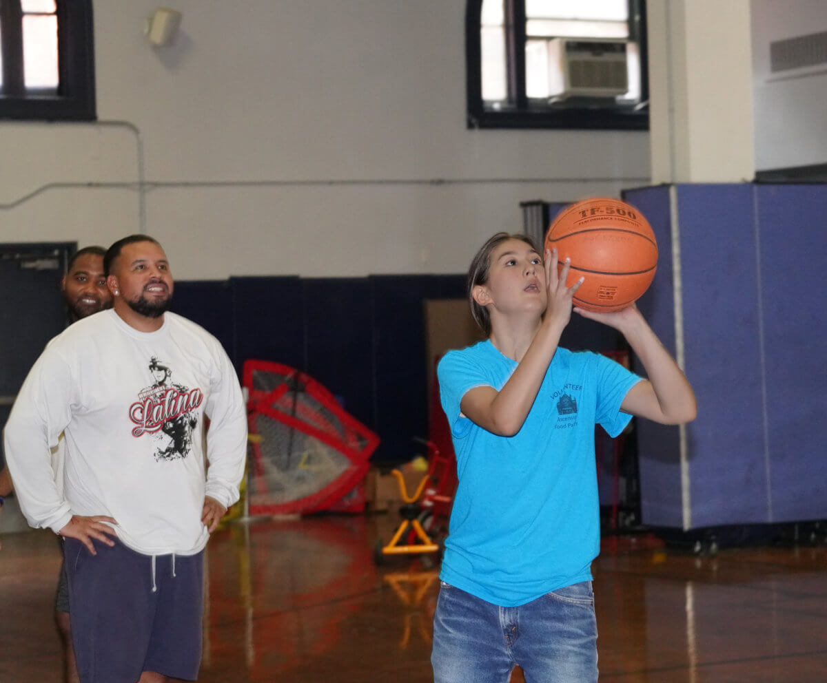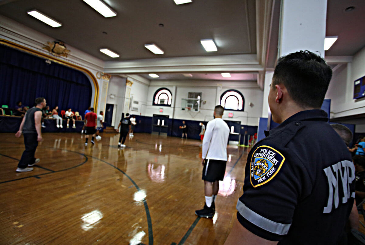 After their work distributing the food items, the NYPD officers and the Spirt Squad strengthened their bond by squaring off in a basketball game. The match saw the likes of Captain Gorman dribbling against youth members inside the church’s gymnasium as fellow officers and other children eagerly watched the game and cooled off with ice pops.