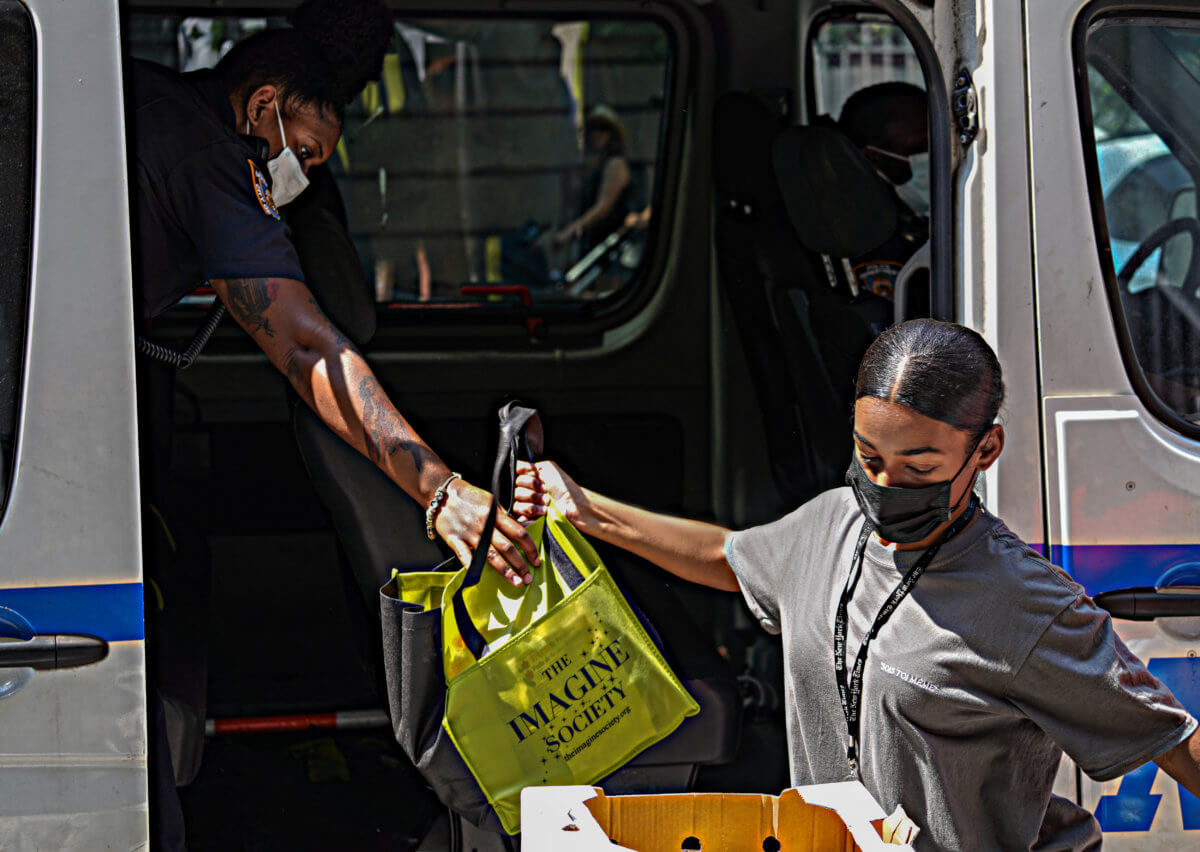 The community care force not only helped pack the bags of fruit, vegetables, and canned goods into carts, they also went the extra mile. Loading bundles of bags into the back of police vans, the children joined the NYPD as they made deliveries to the homebound, such as the elderly and disabled, who are still going without sufficient food access.