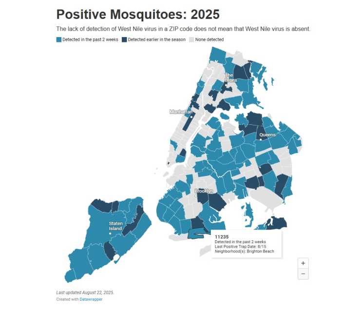 The city’s Health Department routinely traps and tests mosquitoes. Up to 50 mosquitoes are grouped together and tested as a single “pool.” This season, there have been 988 positive mosquito pools across the five boroughs, fewer than at the same time last year, according to officials. Mosquito activity typically peaks in August and September.