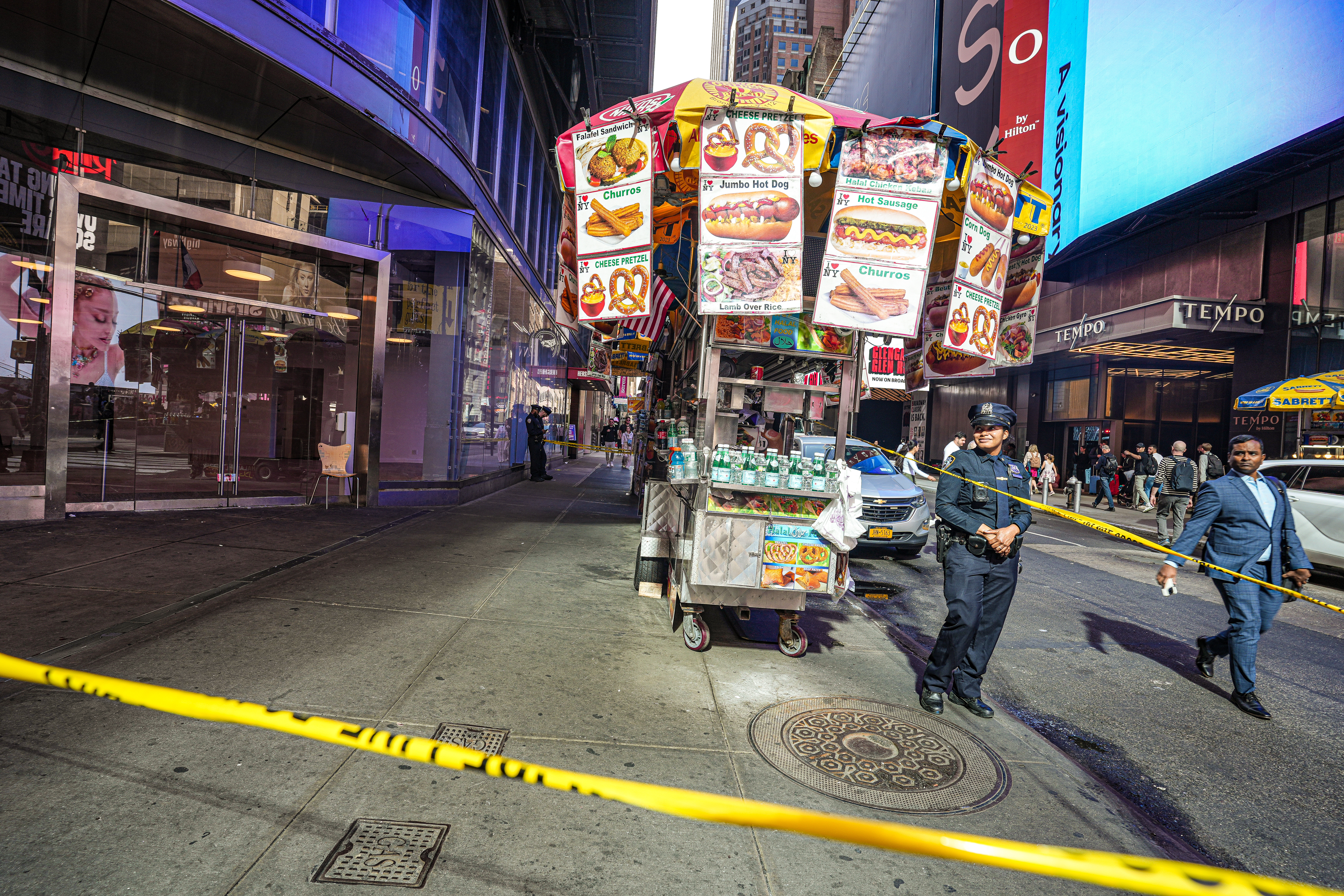 Crime scene tape remained wrapped around multiple food carts at the corner of 47th Street and Broadway just before 10 a.m. on April 30 under the watchful guard of multiple police officers — the remains of a violent dispute.