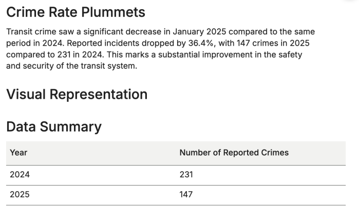 In the first month of 2025, there were 147 reported crimes on the subway down from 231 last year—resulting in 36% fewer crimes committed on the rails this year.