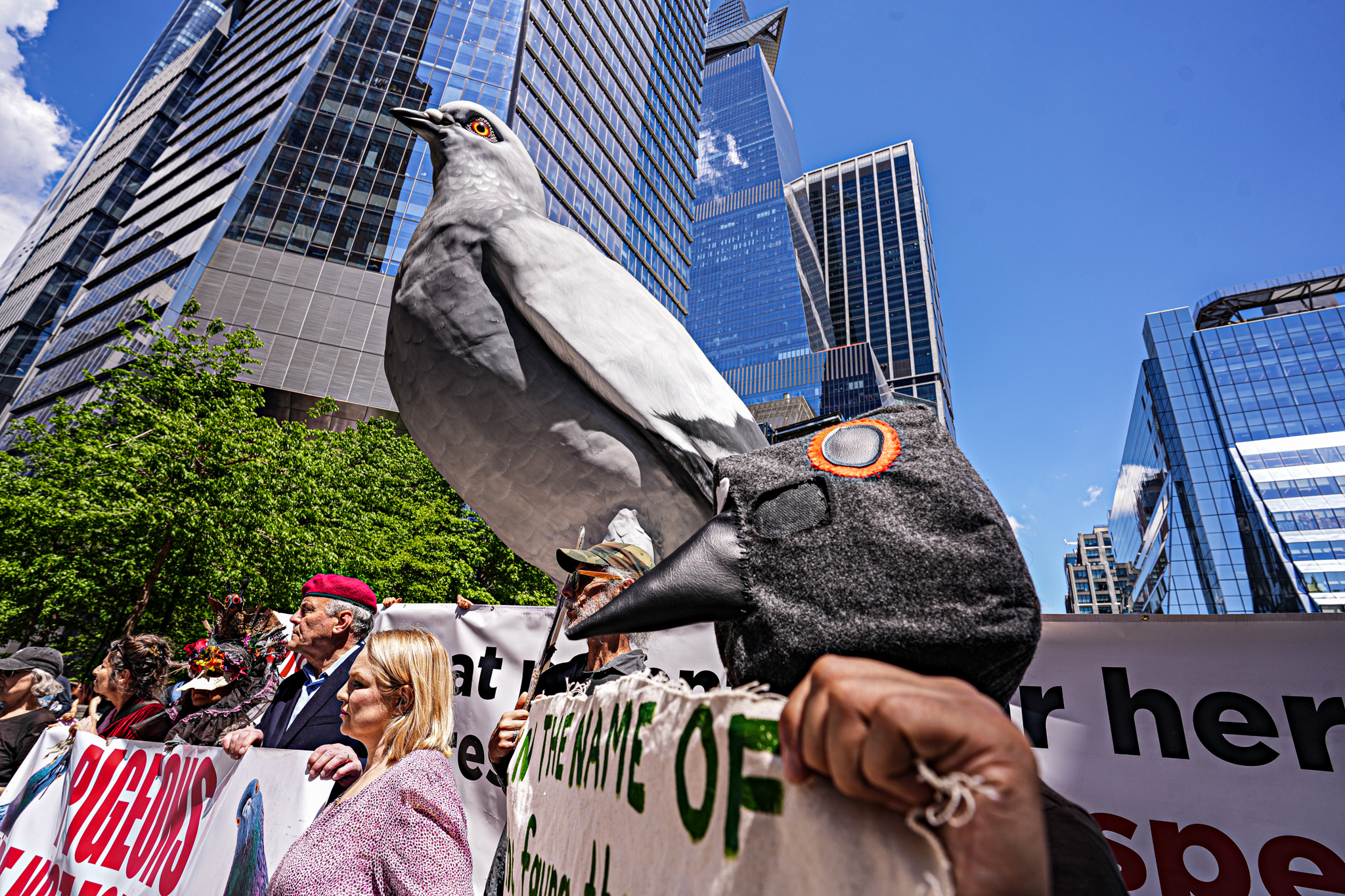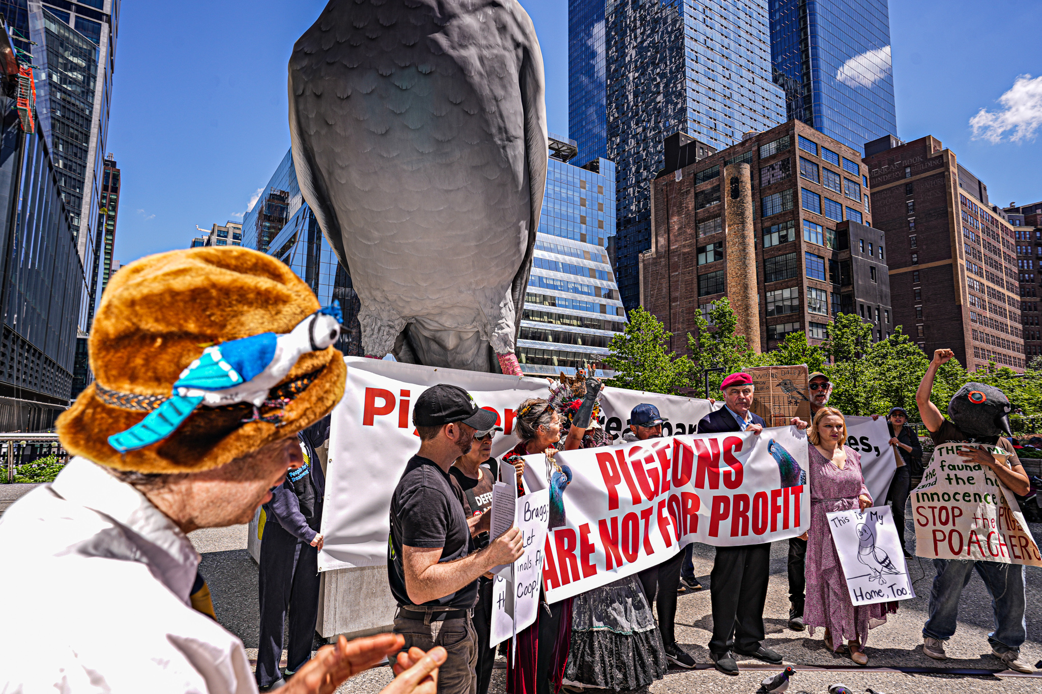 Dozens of animal rights activists rallied on Wednesday under the gigantic pigeon statue at the High Line in Manhattan to draw attention to an ongoing pigeon poaching trend.