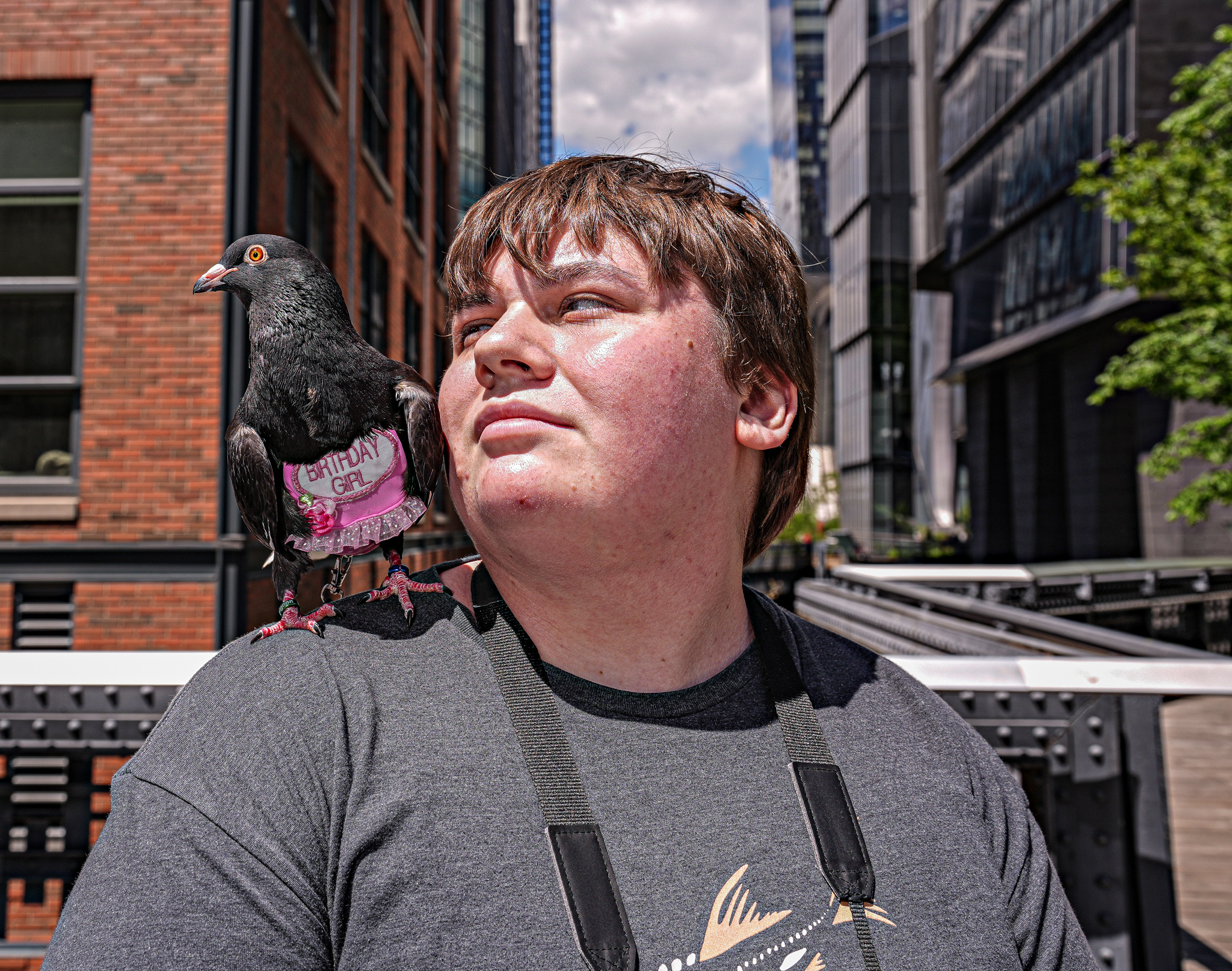 “With these pigeon shootings that are going on, they’re just taken from their families because they mate for life. They fly up, and then at a certain height, they’re just shot to death,” Gabe said as Osprey sat on his shoulder in a little pink dress.